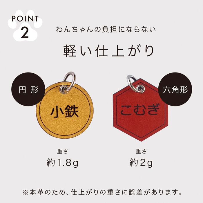 重さ2グラムの本革素材。柔らかくて超軽量なので、ワンちゃんの負担にはなりません。