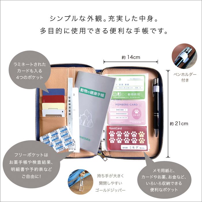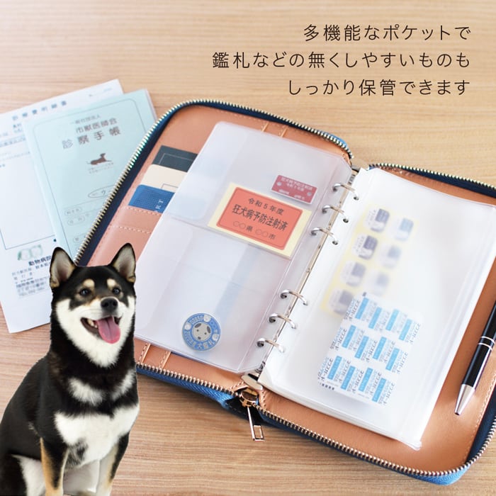 なくしやすい鑑札、狂犬病予防接種済カードをはじめ、 保険カード、診察券、ドッグラン会員証、トリミング会員証などのカード類、 お薬、レシート、処方箋など、大切なものがひとつに収納できます。