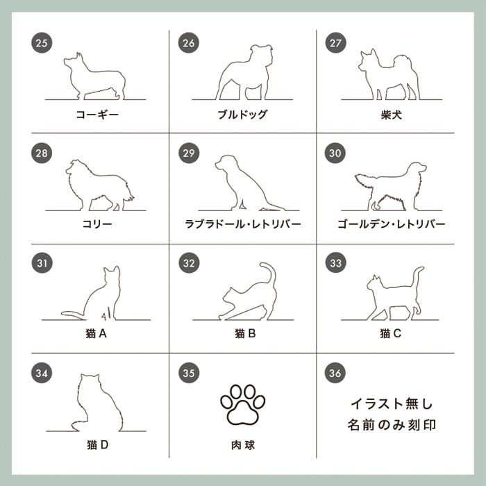 *デザインの関係上、筆記体の場合は「大文字のみ」「小文字のみ」でご入力いただいた場合も、「大文字+小文字」に変更させて頂きます。「大文字のみ」「小文字のみ」をご希望の場合は、備考欄にご記入ください。