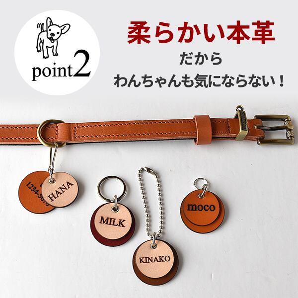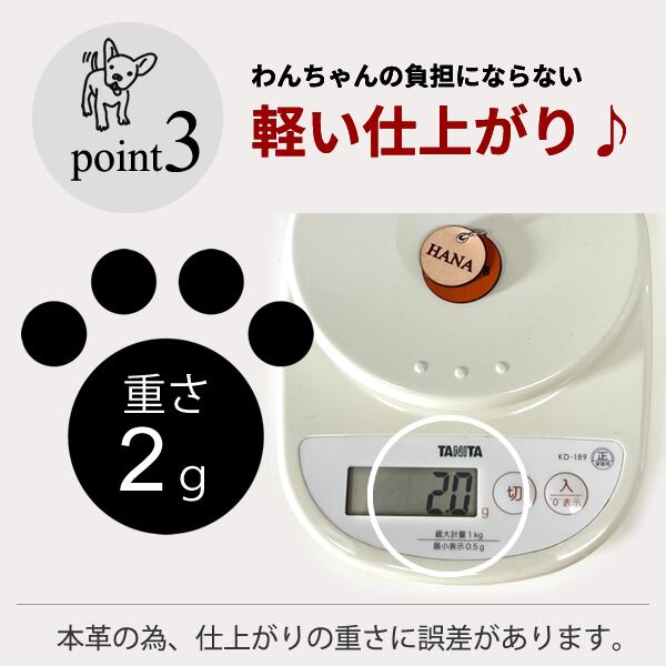 重さ2グラムの本革素材。柔らかくて超軽量なので、ワンちゃんの負担にはなりません。